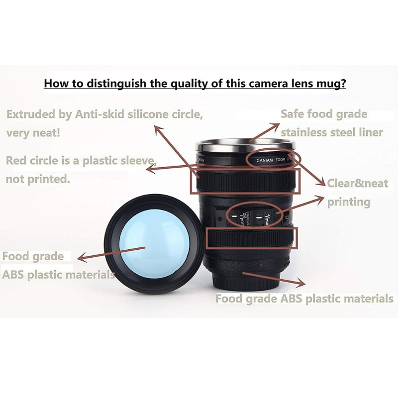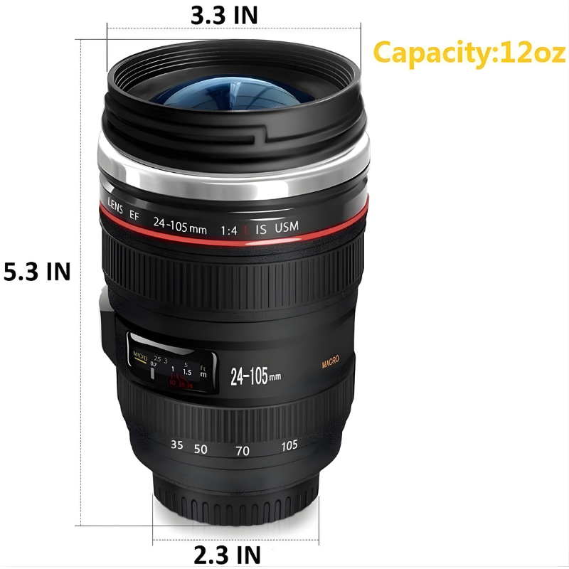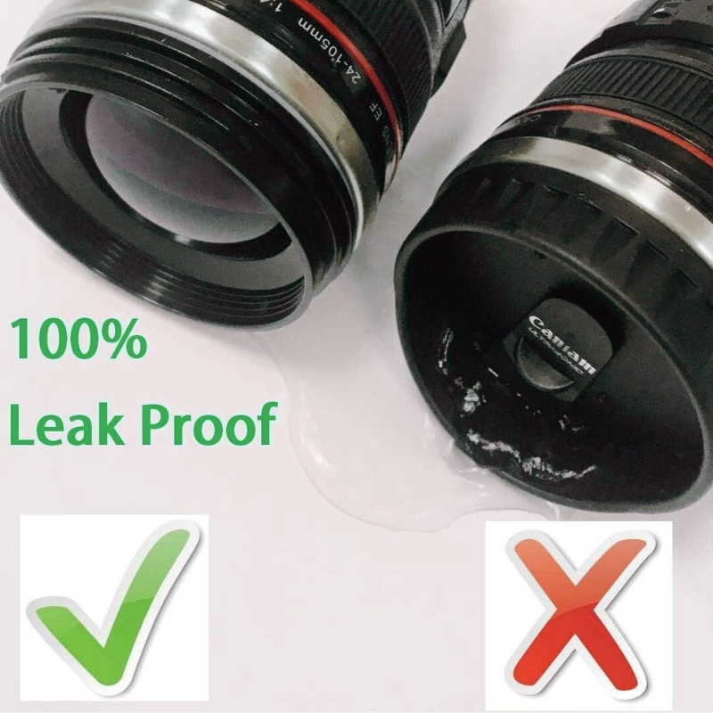 The anti-skid base enhances stability during placement. The lid maintains closure under movement.The Camera Lens Coffee Mug offers practical beverage storage combined with a DSLR-inspired appearance. With stainless steel lining, leak-proof lid, and insulated construction, it suits both travel and office use.