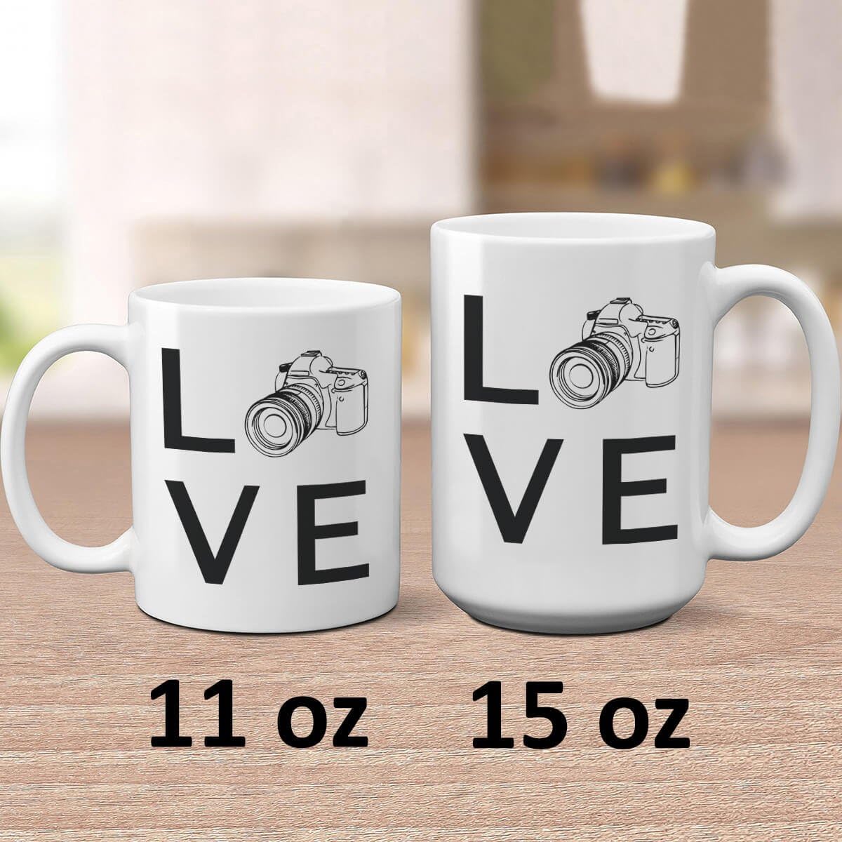 This mug is available in two convenient sizes, 11oz and 15oz. Both options are structured to accommodate coffee, tea, or other hot and cold beverages. The clean white surface enhances the printed design, allowing the camera illustration to stand out with clarity.