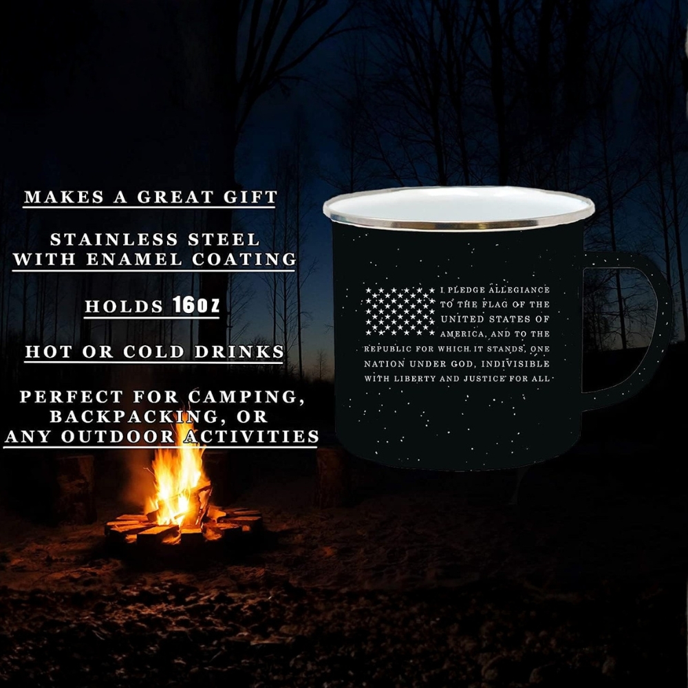 The Pledge Allegiance Themed USA Flag Design Coffee Mug stands out for its meaningful message and classic outdoor design. Featuring the complete Pledge of Allegiance printed clearly across the surface, it serves as both drinkware and a statement piece. The American flag graphic positioned alongside the text enhances its patriotic appeal. Unlike standard ceramic mugs, this USA Flag Enamel Mug uses stainless steel construction with a black enamel coating. This combination offers while maintaining a lightweight feel. It is suitable for camping trips, hiking adventures, hunting excursions, or early mornings at home.