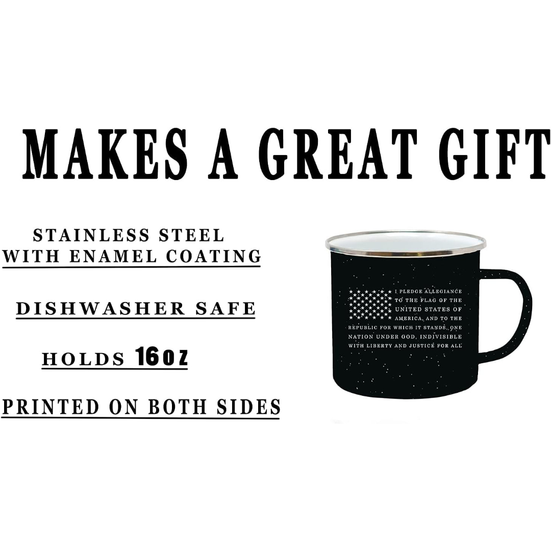 Honor American tradition with this bold Pledge Allegiance Themed USA Flag Design Coffee Mug, featuring the full Pledge of Allegiance printed alongside a stylized American flag design. Built for outdoor use yet suitable for everyday routines, this 16oz enamel-coated stainless steel mug combines patriotic meaning with rugged functionality. Whether you are chilling by the campfire, enjoying coffee on your porch, or gifting a veteran, this USA Flag Enamel Mug delivers both purpose and performance.
