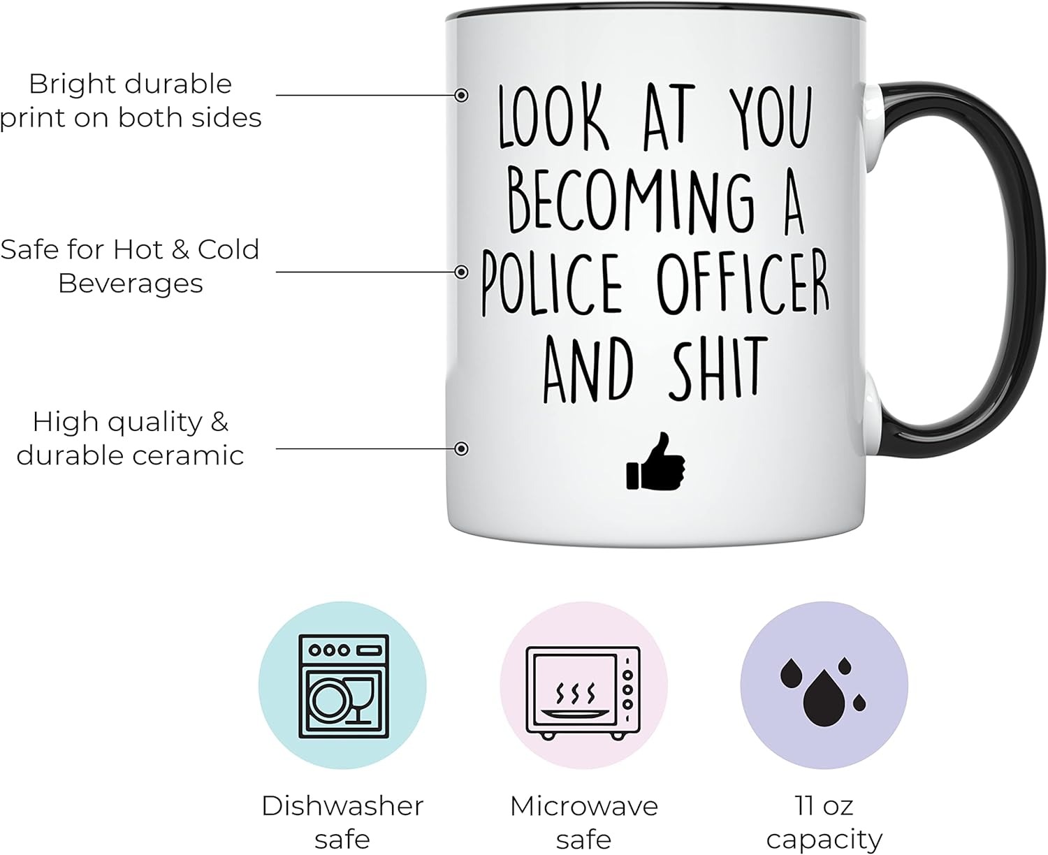 Mark an important milestone with this Police Officer Quote Print 11oz Ceramic Coffee Mug. Designed to honor dedication and achievement, this mug makes a thoughtful graduation or appreciation gift for fresh law enforcement professionals. With bold printed text and a classic white mass paired with a black handle, it offers a clean and professional look.