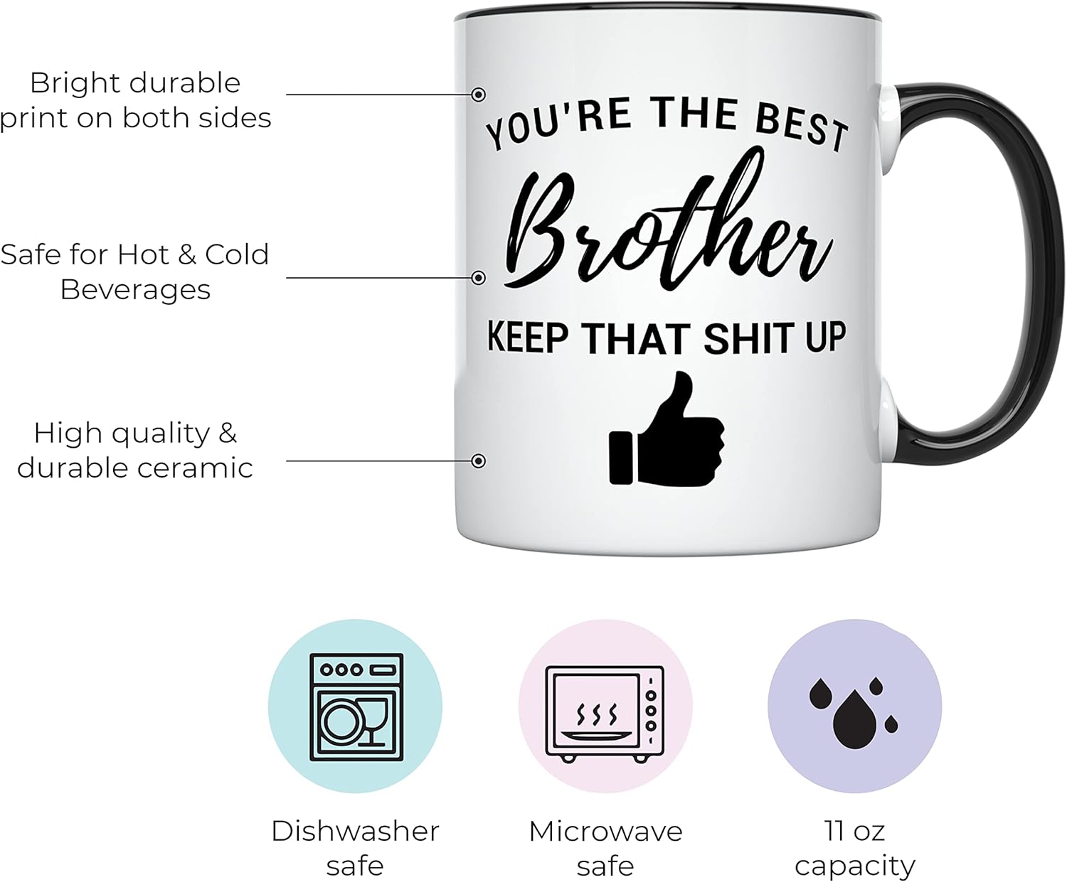The Quote Printed Ceramic Coffee Mug For Gifting is a practical ceramic mug designed for everyday beverage enjoyment and special gifting occasions. With an 11oz capacity, microwave compatible design, and dishwasher-friendly surface, it is suitable for home and office use. If you are looking for a useful and meaningful mug for your brother, this option provides both function and personal worth.