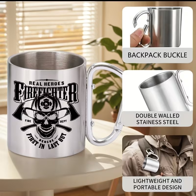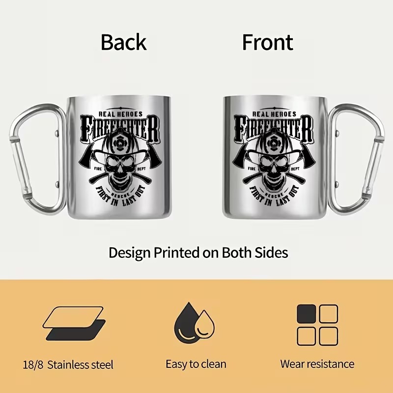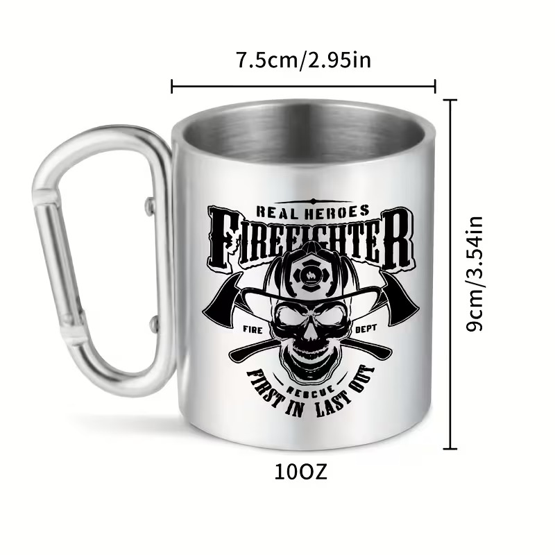 The 1Real Heroes Fire Fighter Text Print 10oz Coffee Mug With Graphic Design delivers dependable construction and eye-catching style in one compact design. Made from 304 stainless steel and featuring a firefighter-inspired osseous head and axes graphic, it fits seamlessly into outdoor adventures, professional environments, and home use. A reliable choice for those seeking a distinctive and practical coffee mug.