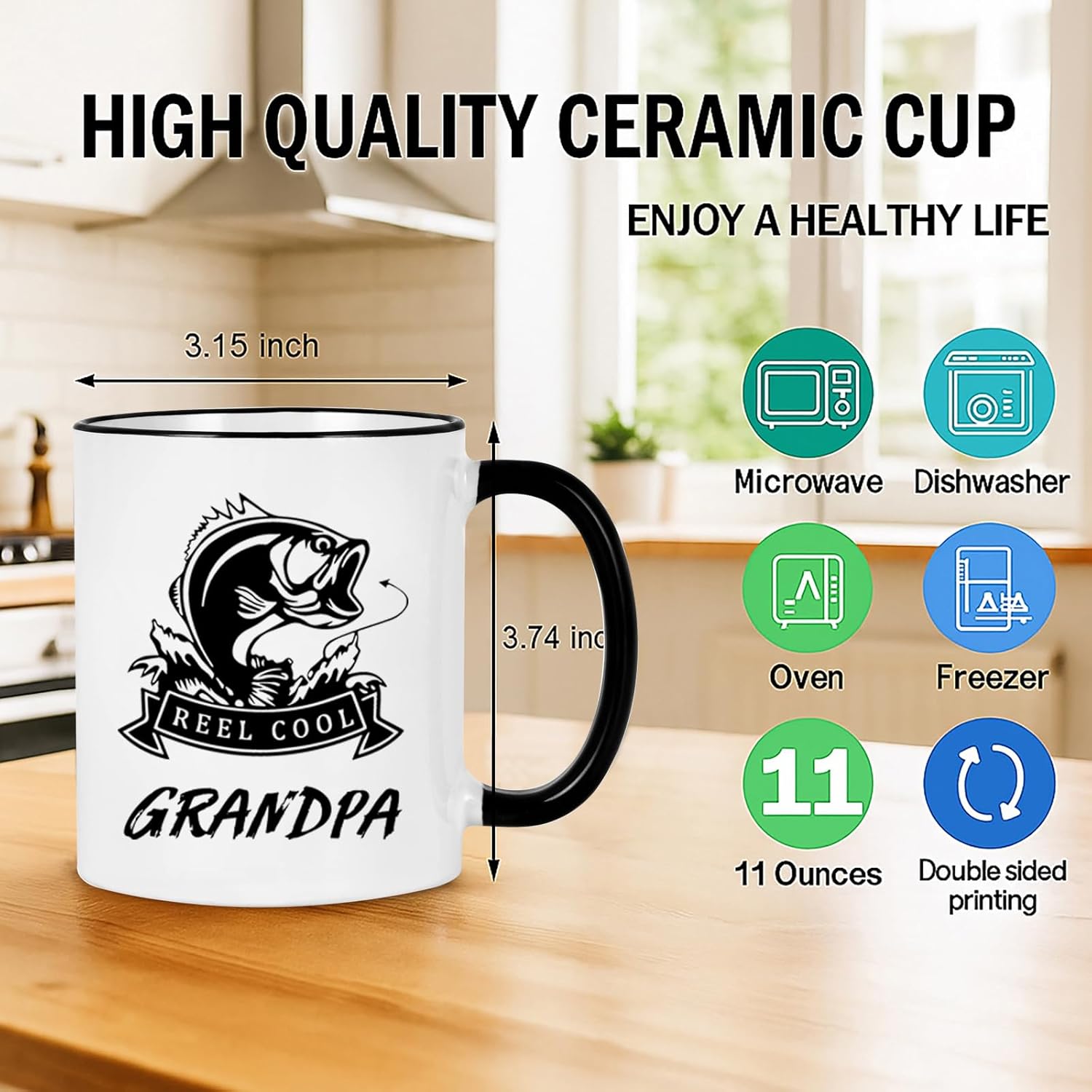 - Design: The mug features a bold "Reel Cool Grandpa" design with a fishing theme, perfect for any Grandpa who enjoys fishing.
