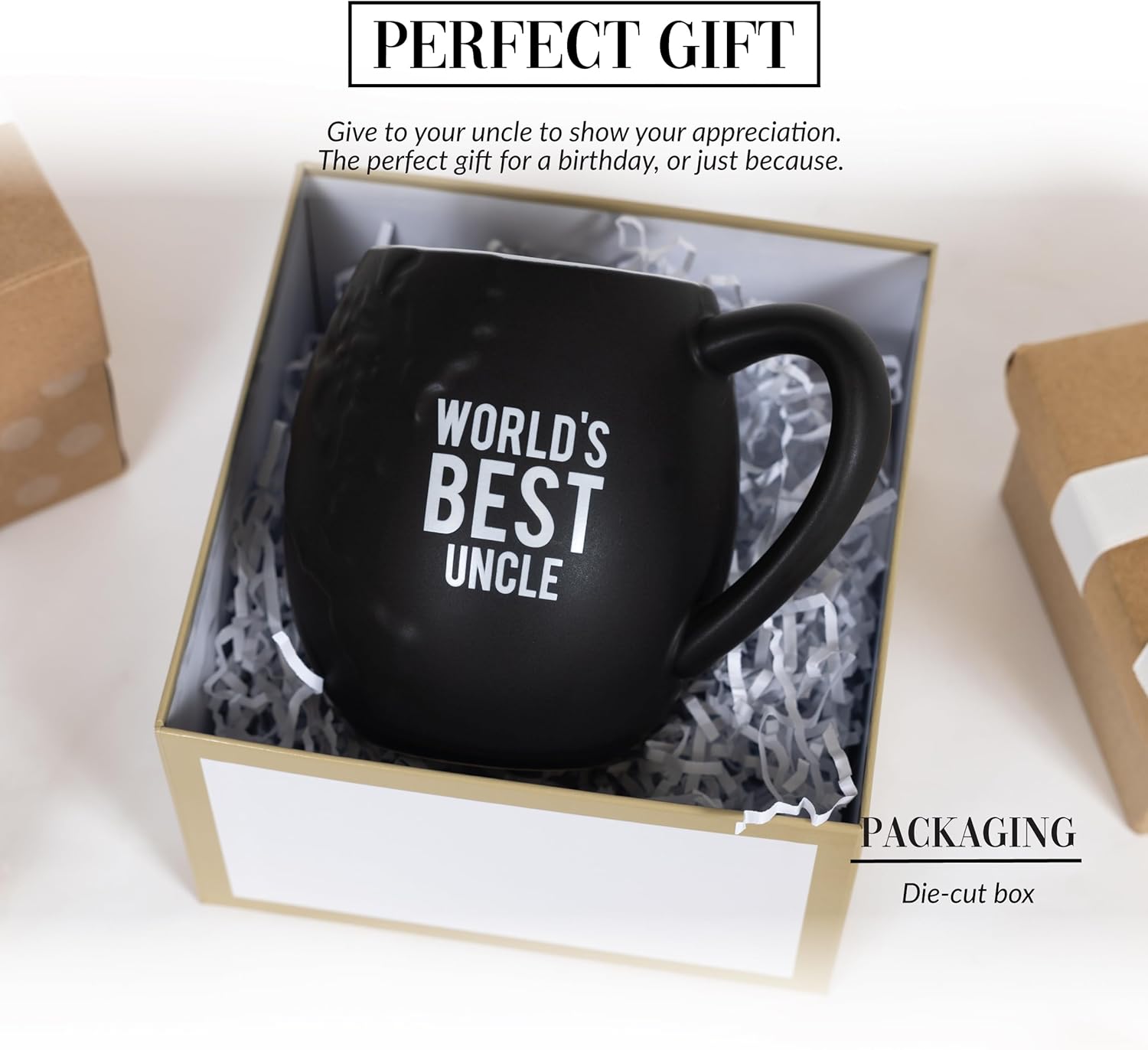 This Rounded Globe Style Coffee Mug For Uncle features a rounded inspired by globe and planet shapes, creating a distinct profile compared to traditional mugs. The embossed world map adds surface texture, while the matte exterior contrasts with the smooth glossy interior. The printed text is positioned to remain visible during use without interfering with the mug’s balance or handling.