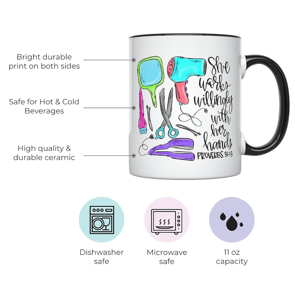 The She Works Willingly With Her Hands Text Printed Hairstylist 11 Oz Coffee Mug is created for salon professionals who bring creativity and dedication to their craft each day. This ceramic cup highlights a meaningful message that reflects commitment and skill. Designed for daily routines, it supports morning beverages, afternoon breaks, or studio desk placement without fading or peeling over time.