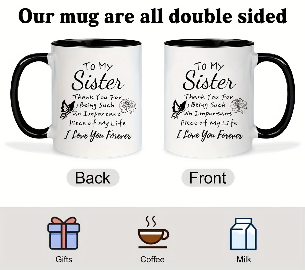 Designed for gifting, this ceramic mug is an excellent choice for birthdays, special celebrations, or moments when you want to show gratitude to a sister or close friend. Its timeless style makes it suitable for home kitchens, office desks, or decorative coffee stations. With an 11oz capacity, it provides a practical size for daily drink servings while also serving as a keepsake-style cup that carries emotional usefulness.