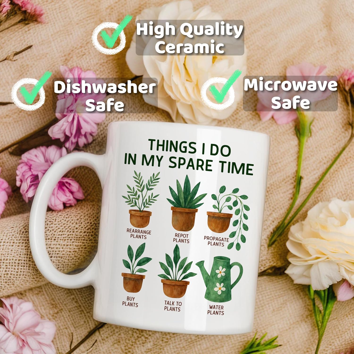 The Spare Time Planting Hobby Themed Coffee Mug is a charming and relatable coffee cup designed for plant enthusiast who proudly spend their spare time caring for greenery. Featuring the heading “Things I Do In My Spare Time,” this 11oz ceramic mug showcases illustrated potted plants alongside humorous captions such as rearrange plants, repot plants, propagate plants, talk to plants, and water plants.