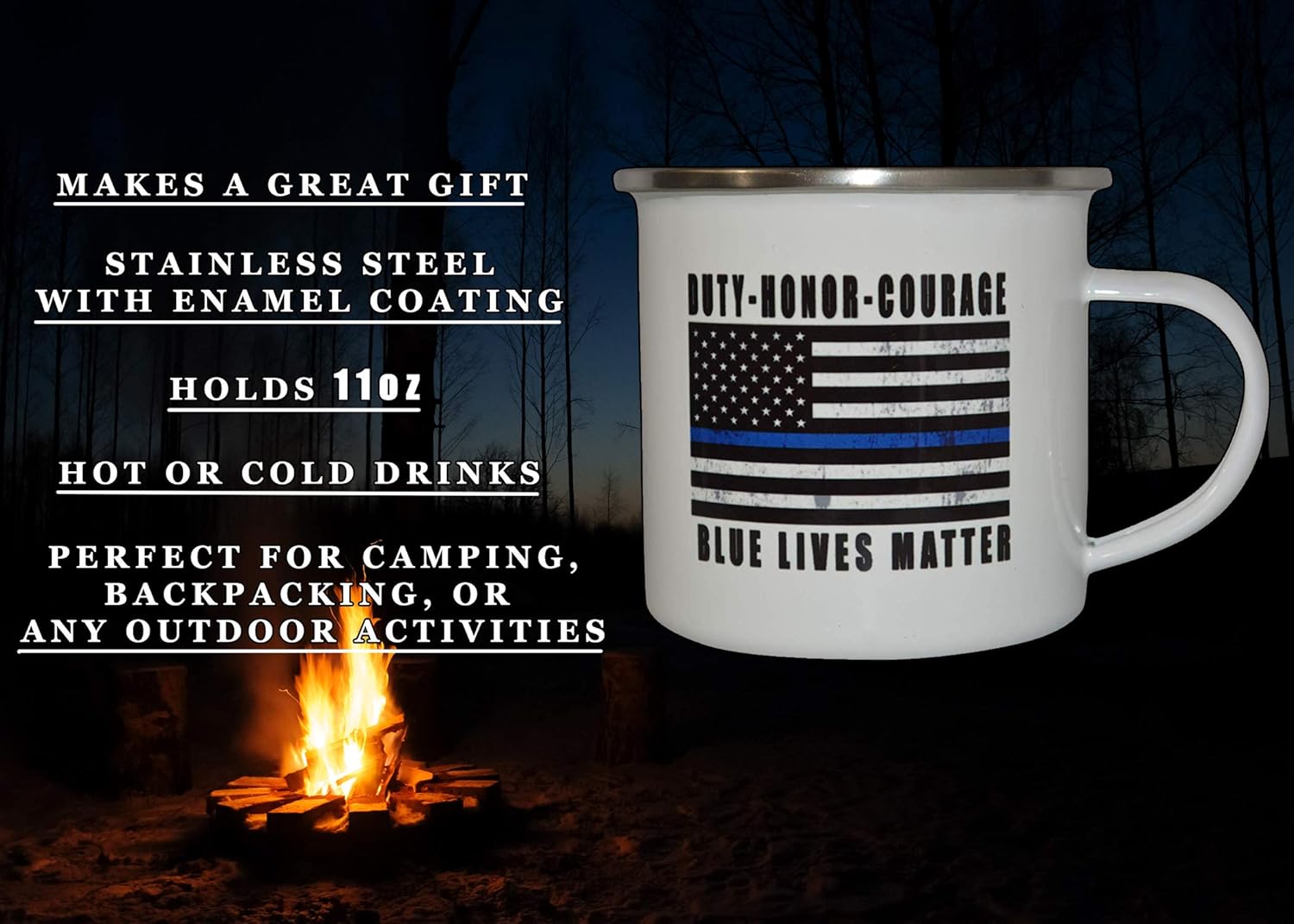 Show your support with this Stainless Steel Coffee Mug For Police Officer, designed in a classic camp-style shape with stainless steel construction and enamel coating. Featuring the American flag with a single blue line and the words “Duty • Honor • Courage” and “Blue Lives Matter,” this mug delivers a bold statement in a practical outdoor-ready design.