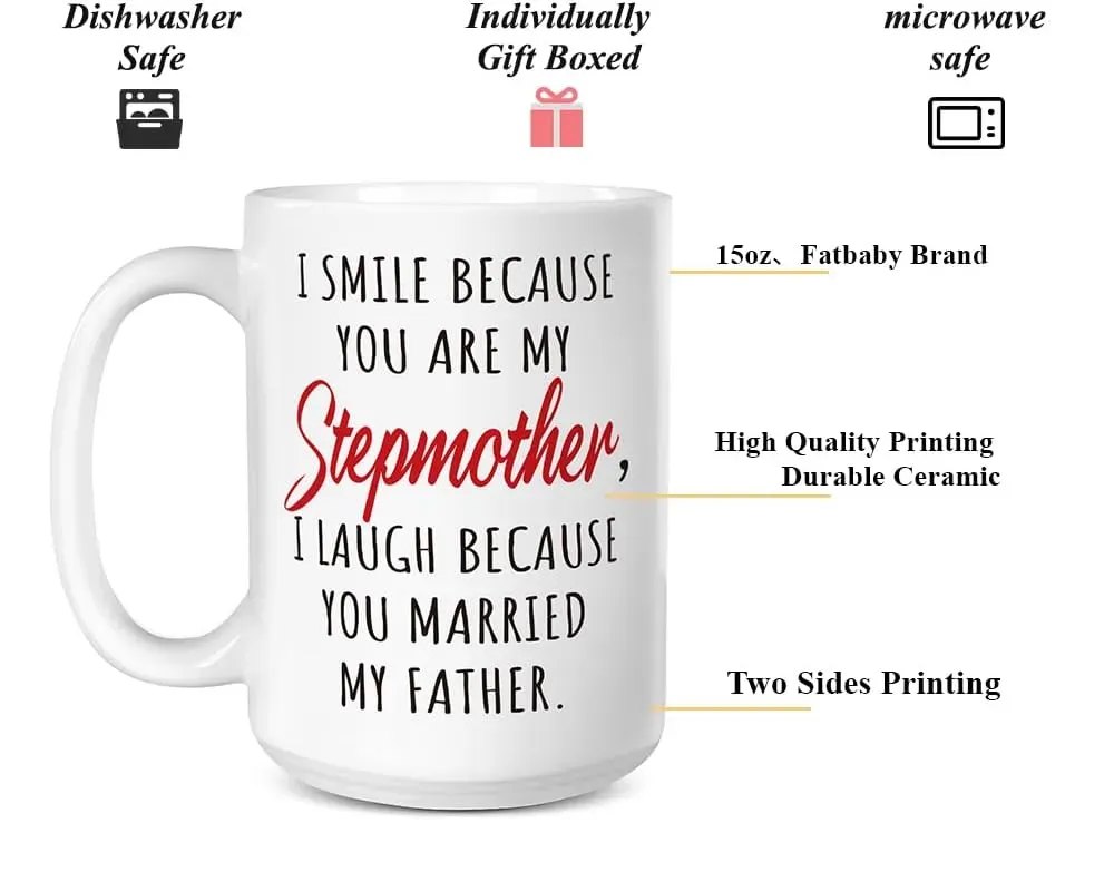 The Stepmother Quote 15oz Ceramic Mug combines a practical drinkware format with a bold printed message design intended for daily use. With a 15 fl oz capacity, ceramic build, and routine-friendly care options, it fits into common home and office setups without requiring special handling. The Stepmother Quote Ceramic Mug style focuses on clear typography and a simple silhouette, making it easy to integrate into an existing mug collection while keeping the message visible during use.