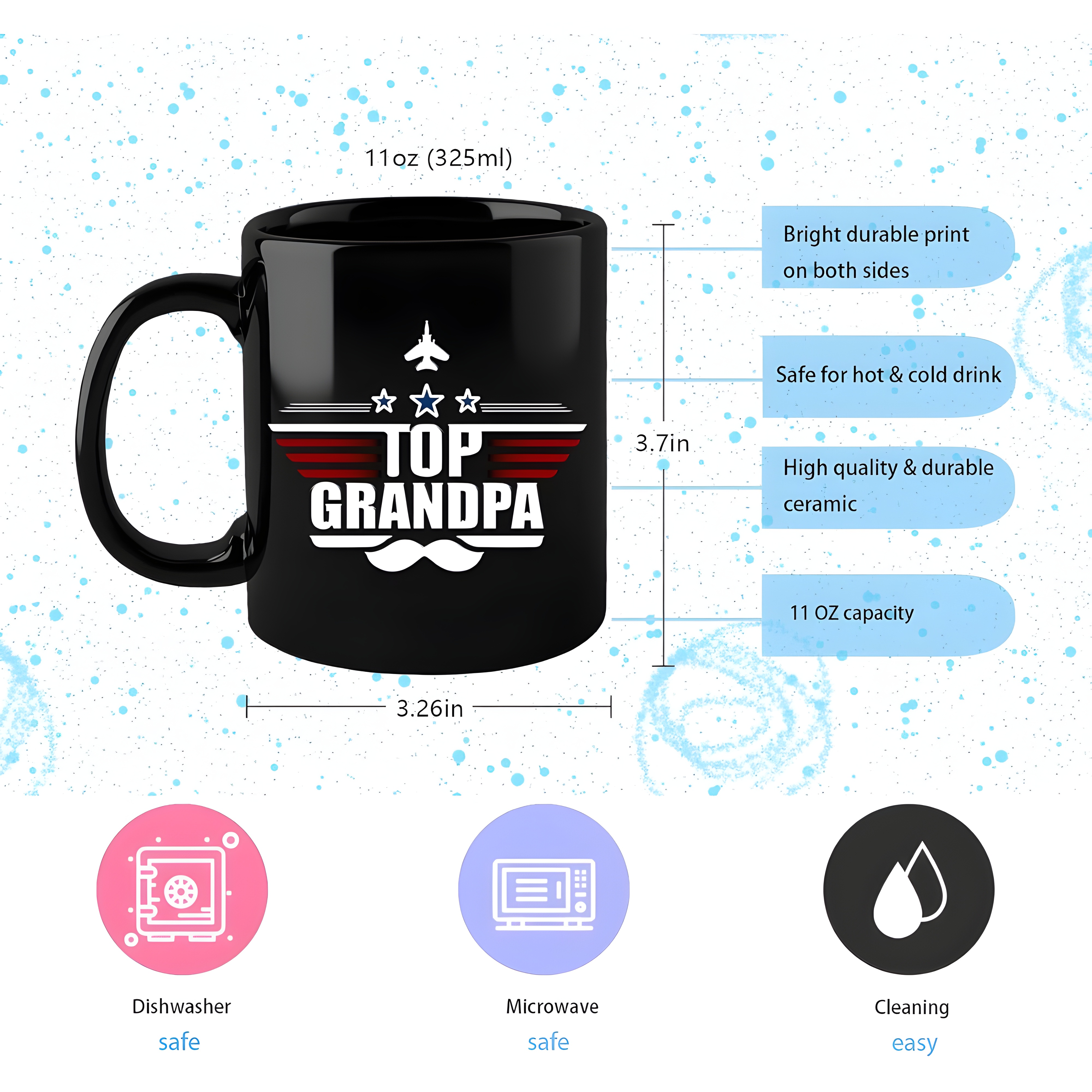 This Top Grandpa Text Printed 11 Oz Coffee Mug offers a straightforward and bold design intended for everyday routines. Crafted from a solid ceramic material, the mug serves well as a drink container for hot or cold beverages. With a printed exterior featuring the phrase “Top Grandpa,” it brings functional clarity to a well-sized cup.