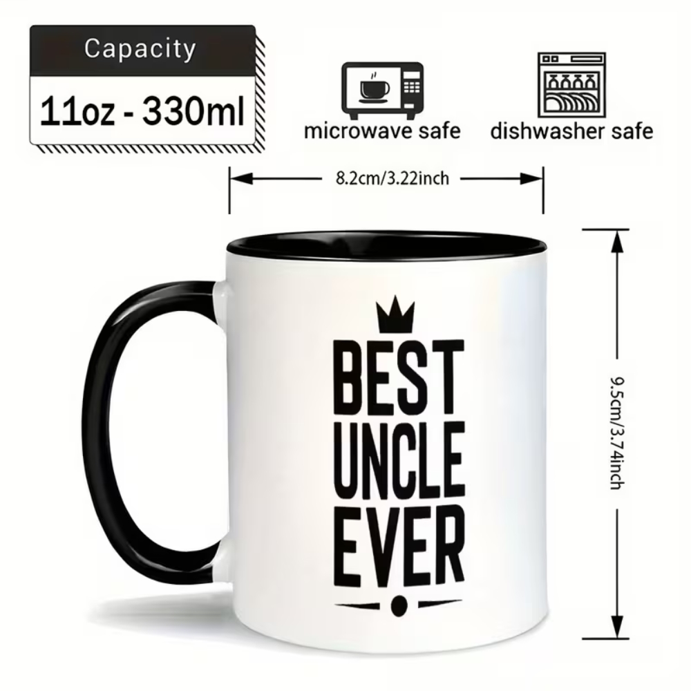 The Uncle Ever Coffee Mug is an 11oz ceramic message mug designed for hot drinks, daily routines, and family gifting. With a bold text layout, crown icon detail, two-tone accents, and an included lid, it suits home kitchens and office desks alike. Its reusable format and straightforward care make it a useful item for Father’s Day, holiday gatherings, milestone celebrations, and everyday appreciation.