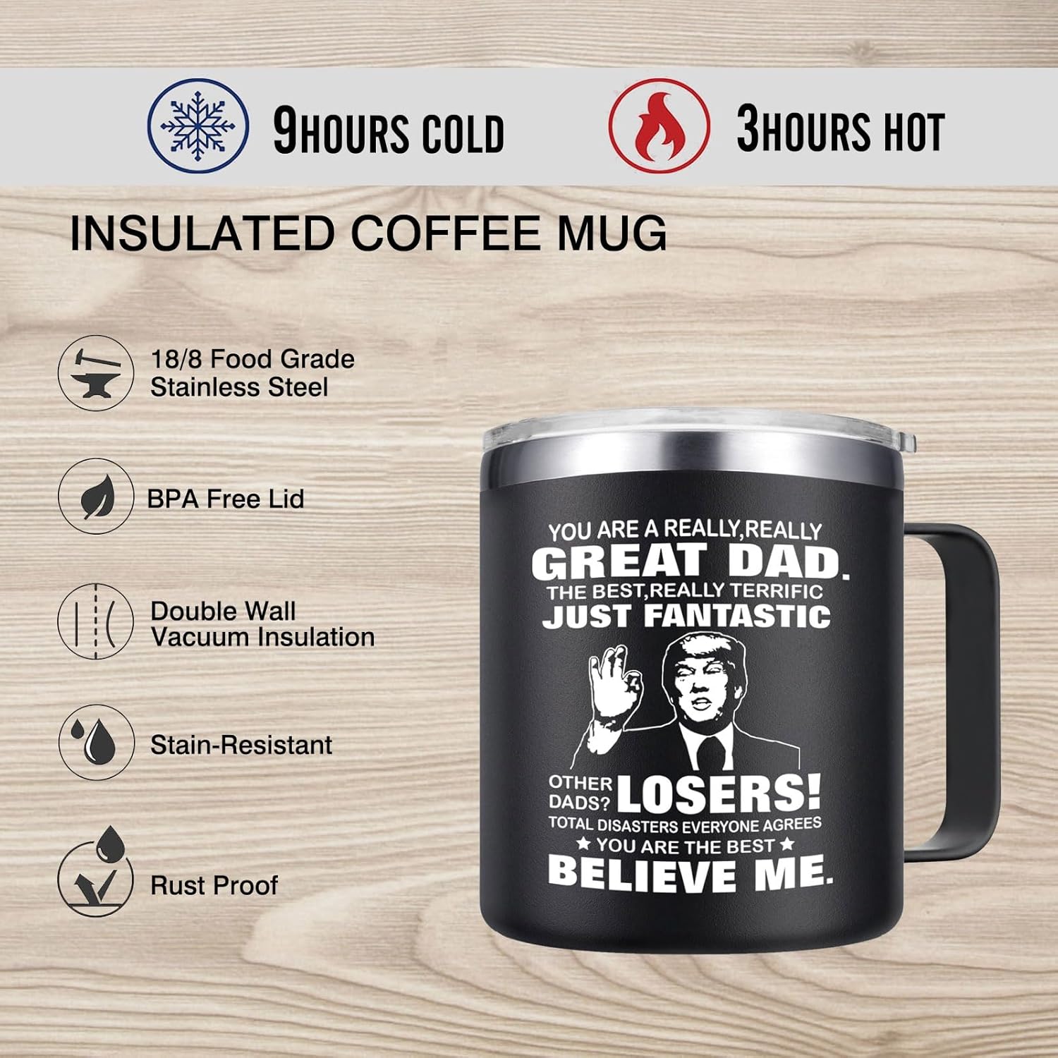 The Stainless Steel Dad Mug is built for casual use. With a bold quote and structured form, it bridges humorous design and practical drink storage. It holds a standard amount of beverage, comes with a lid, and supports both hot and cold use.