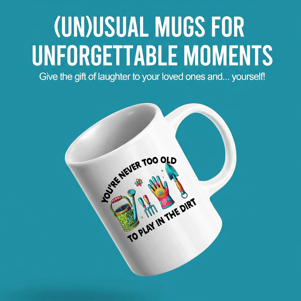 The You Are Never Too Old Printed Coffee Mug With Garden Tools Design blends humor and inspiration with everyday practicality.